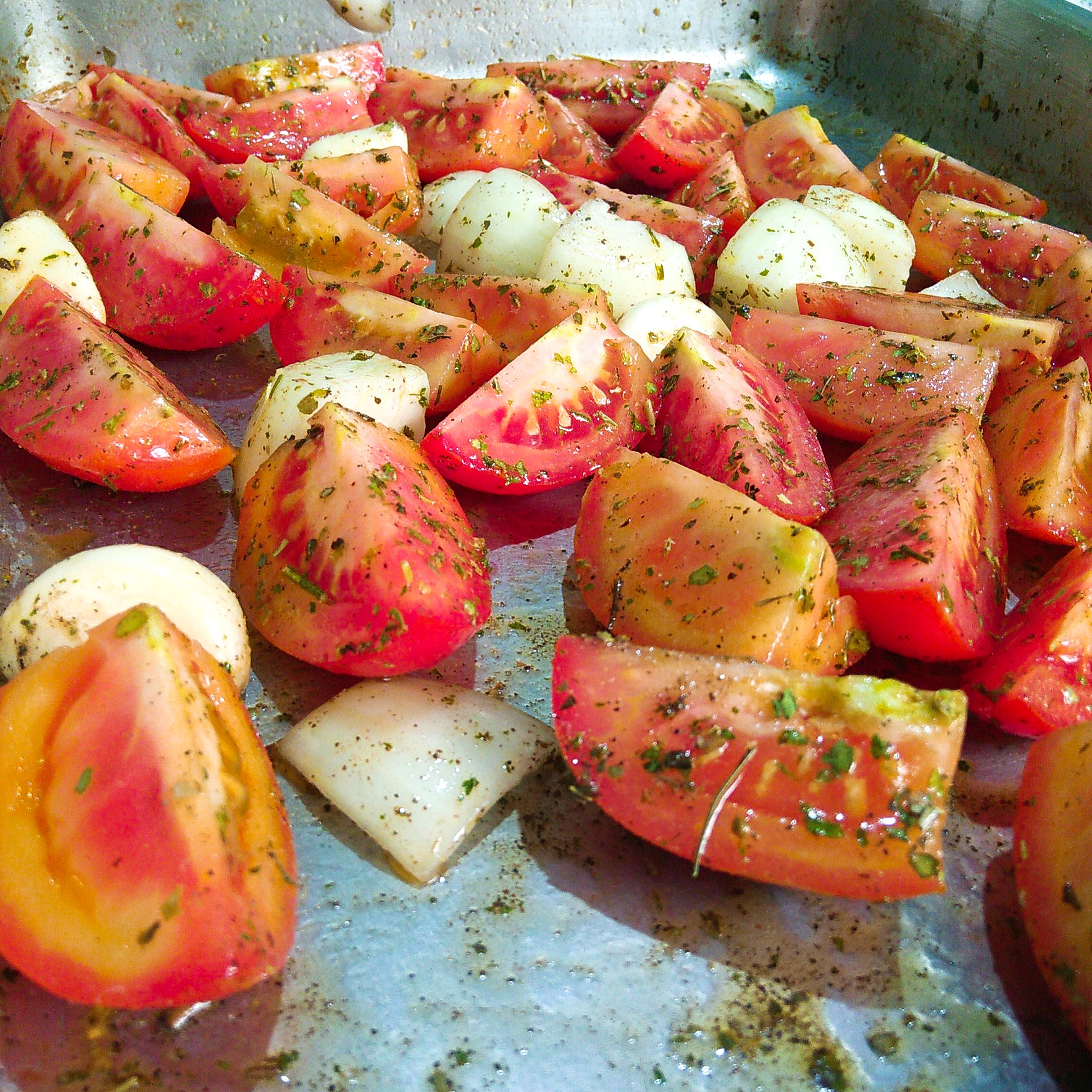- In a small mixing bowl stir together olive oil, Italian seasoning, salt and pepper. Then pour over the tomatoes, onions and garlic, toss to coat.