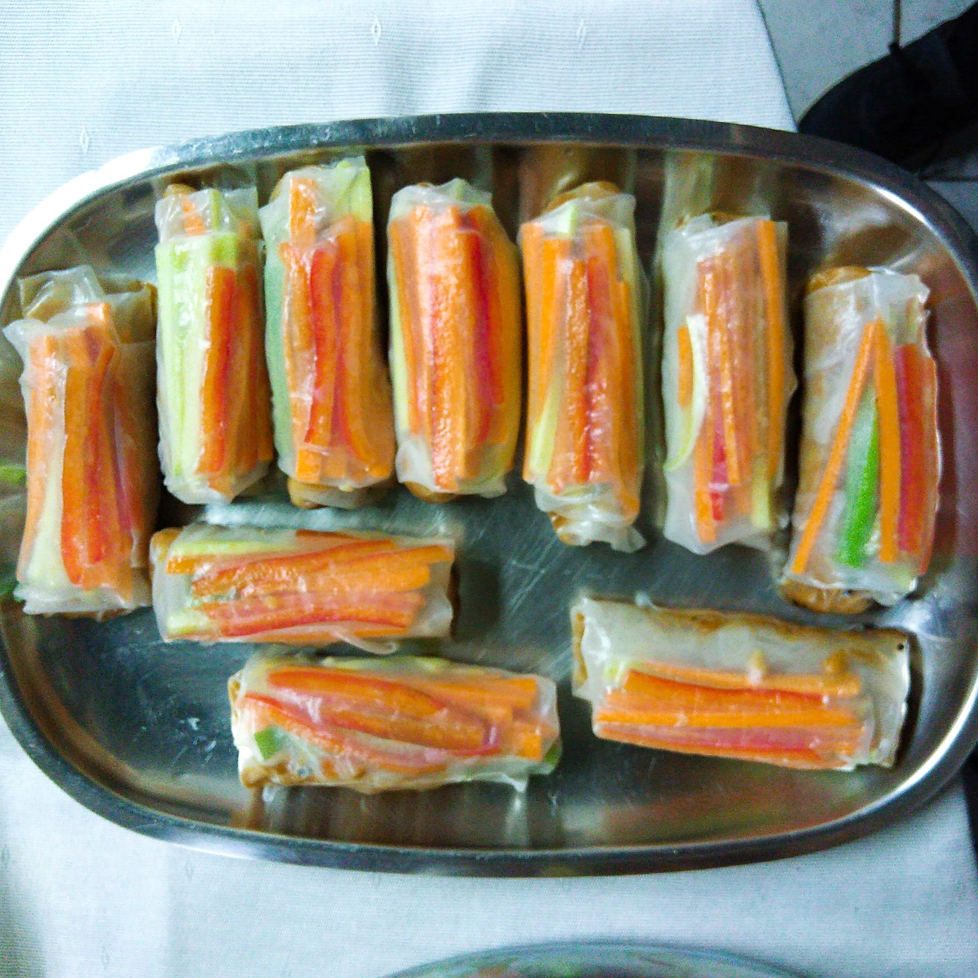 - Using a pan large enough to fit the Rice Paper Wrappers in, fill with about 1 inch/2.5 cm of water. Warm the water on low heat until flexible about 1 minute. Place the rice paper on a flat surface starting near the bottom, place a small amount of noodles. Then about 1 inch/2.5 cm above the noodles layer your veggies 3-4 pieces of each. Sprinkle the green onions and chopped peanuts over the noodles. Starting from the sides fold in over the top of the filling, then from the bottom begin to roll up. You can fold tightly, but be careful not to pull too much or you will rip the paper. It may take a few tries to get it down. See video below!